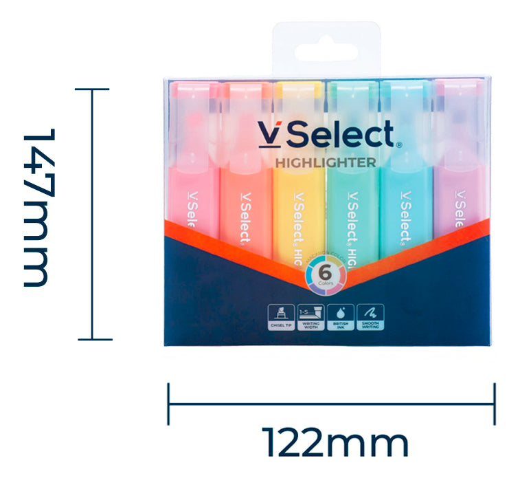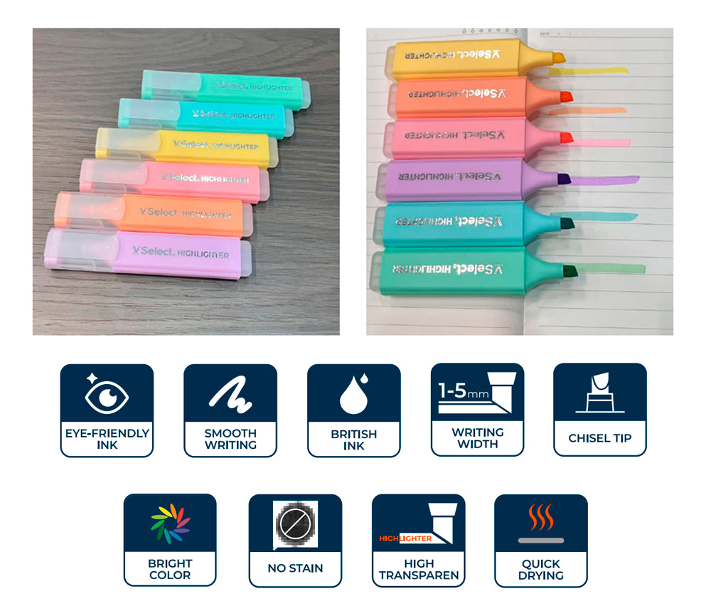 Set de 6 resaltadores en colores PASTELES, diseñados para ofrecer máxima visibilidad y trazos uniformes en estudio, oficina o uso escolar.