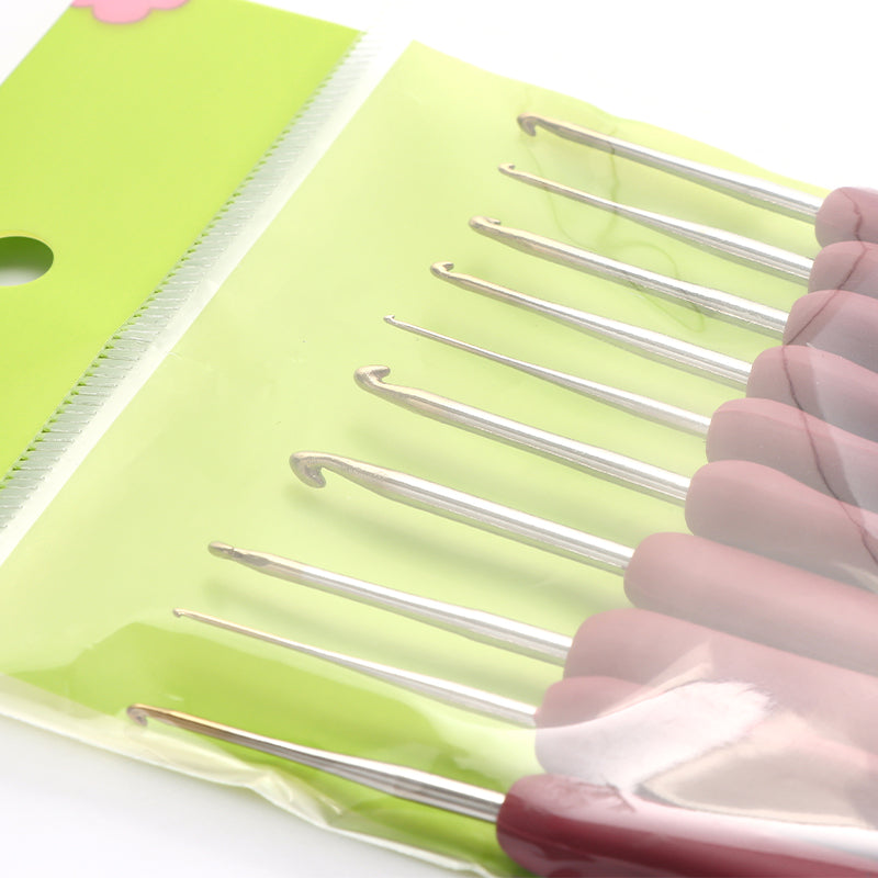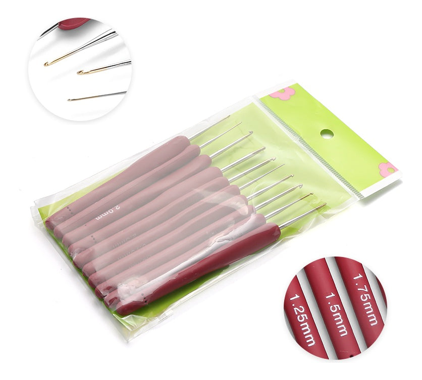 Set de 10 crochet de color rojo con mango de silicona. El set incluye crochet de 0.6mm, 0.75mm, 1.0mm, 1.25mm, 1.5mm, 1.75mm, 2.0mm, 2.25mm, 2.5mm, 2.75mm