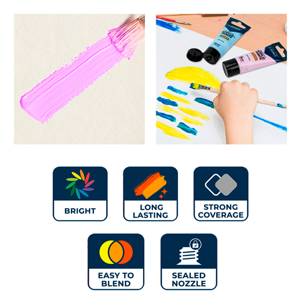 El set incluye 6 tonos suaves y pastel inspirados en la paleta macaron, ideales para proyectos decorativos, ilustración, arte infantil y manualidades creativas. Cada tubo contiene 35 ml de pintura acrílica de alta calidad, con excelente cobertura y un acabado limpio y uniforme.