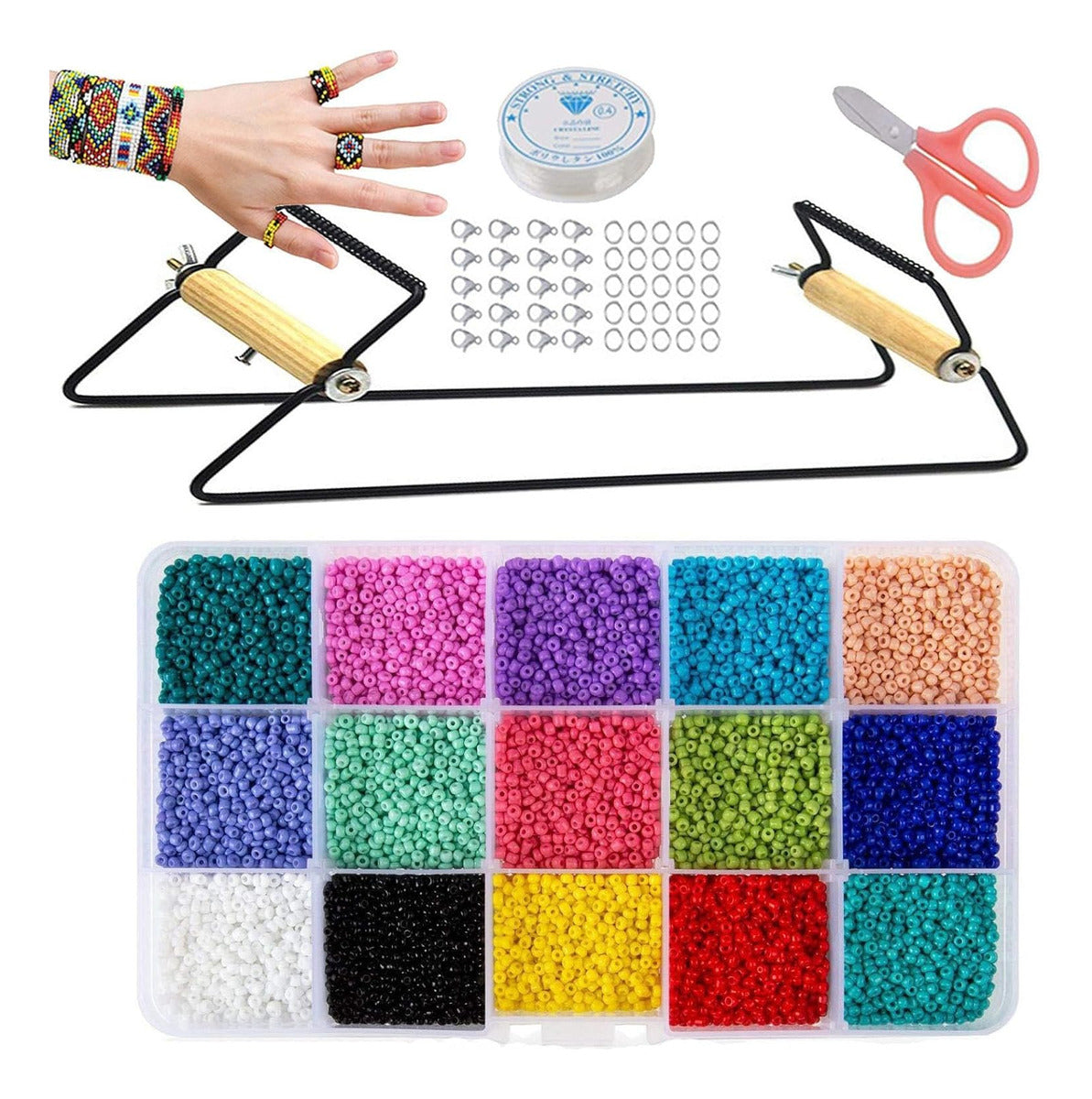 Incluye telar metálico resistente, caja con 15 colores de mostacillas, hilo elástico, tijeras y cierres metálicos.
