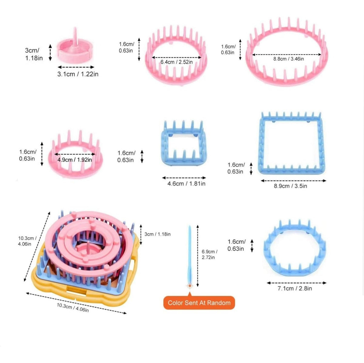 El set incluye pomponeras de los siguientes tamaños: 3.8cm, 4.8cm, 6.8cm y 8,8cm.