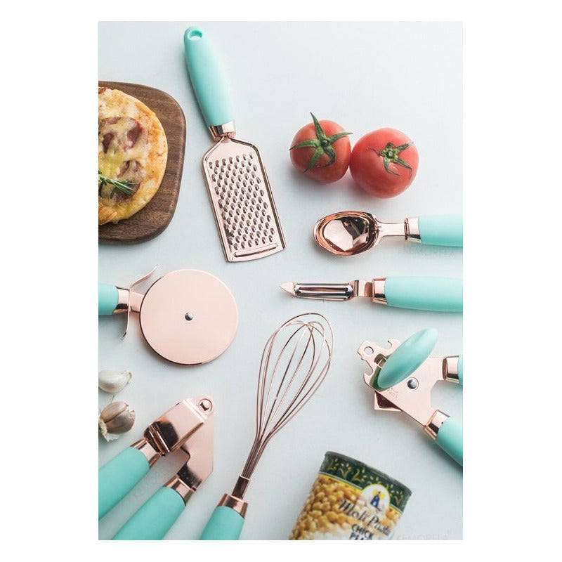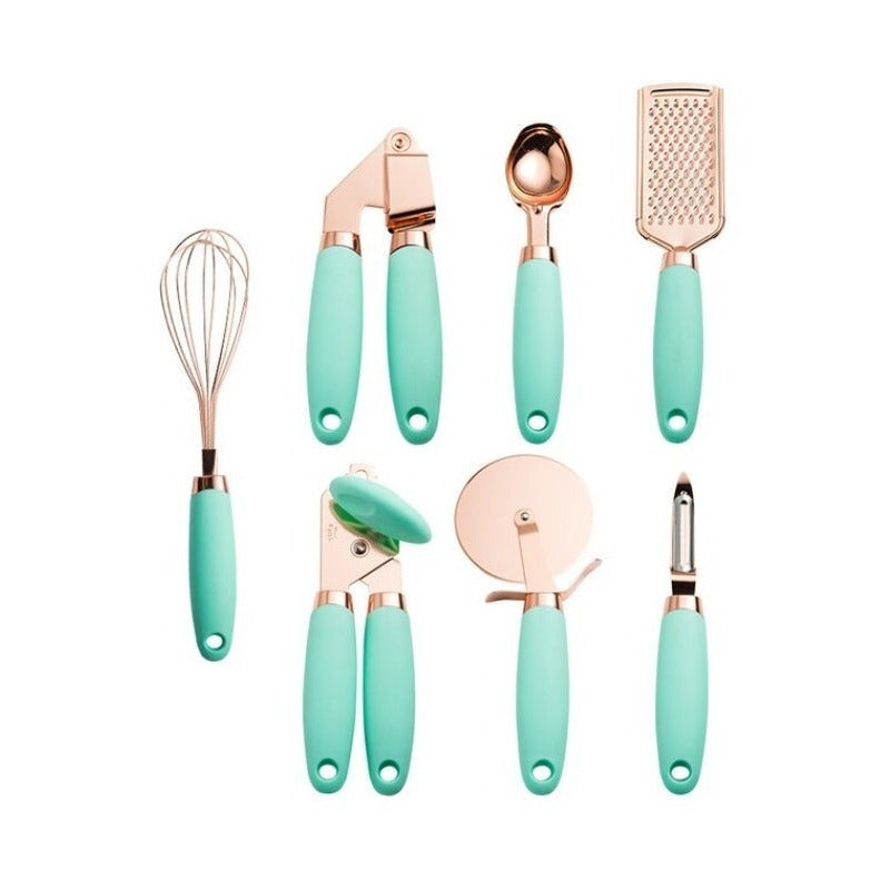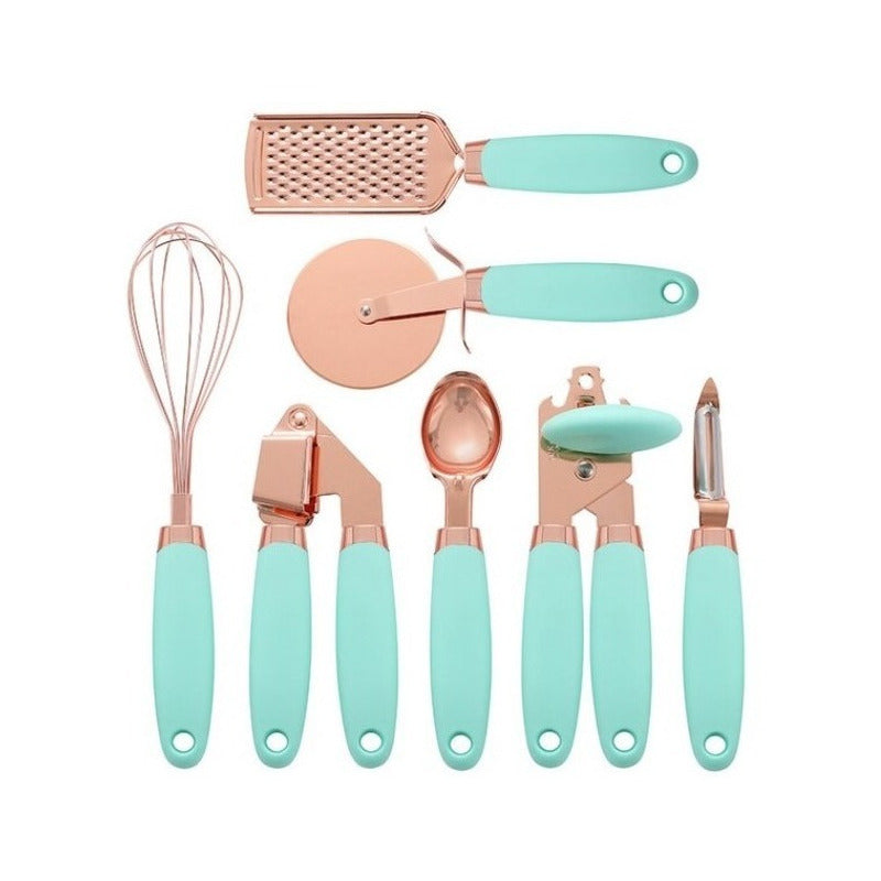 Set de hermosas herramientas de cocina, de acero inoxidable color cobre con mangos de color rosados y aqua.
