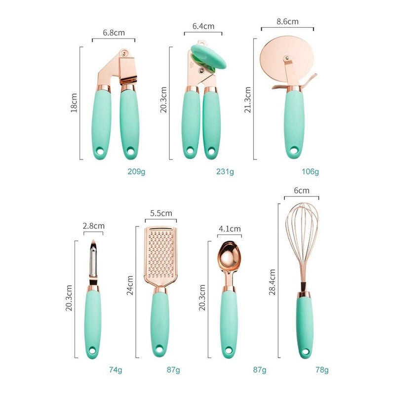 El set contiene pelador, batidor, cortador de pizza, abridor de latas, prensa de ajo, cuchara y rallador. Resisten a altas y bajas temperaturas, contacto directo con alimentos.